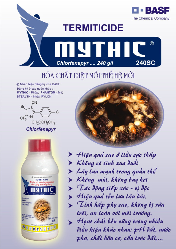 - MYTHIC 240SC chứa 240 g/lít hoạt chất Chlorfenapyr, là sản phẩm diệt mối thuộc thế hệ hoạt chất mới Pyrrole do công ty BASF (CHLB Đức) đăng ký độc quyền. Chlorfenapyr diệt mối qua đường tiêu hóa & tiếp xúc.